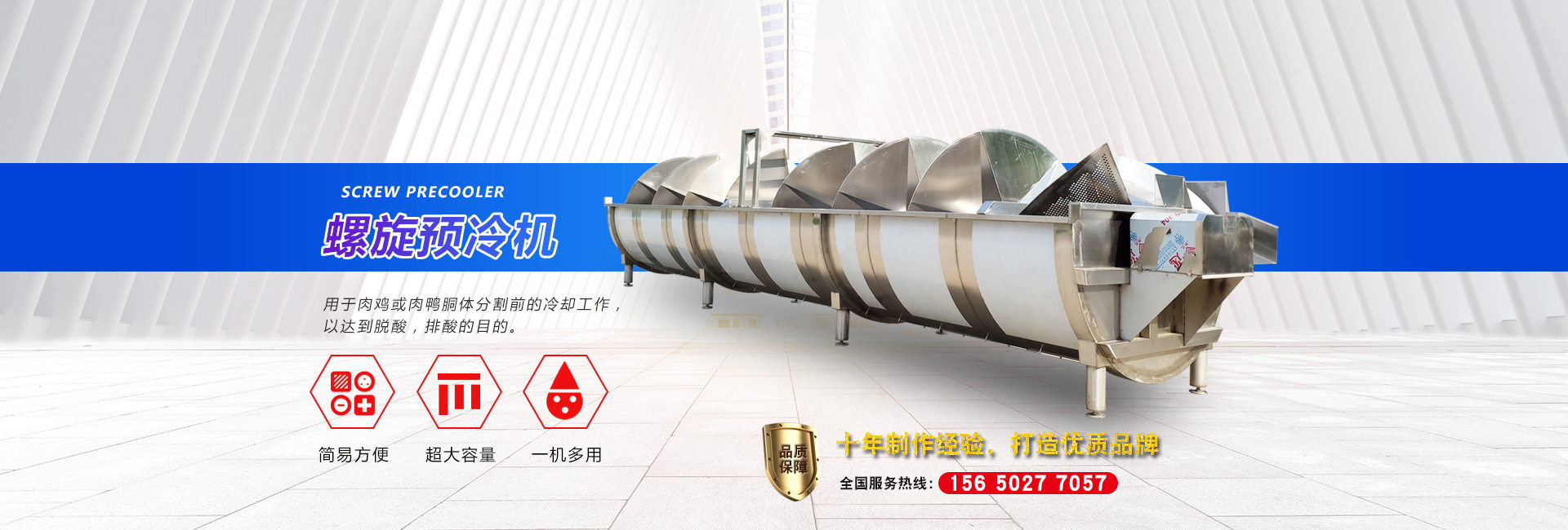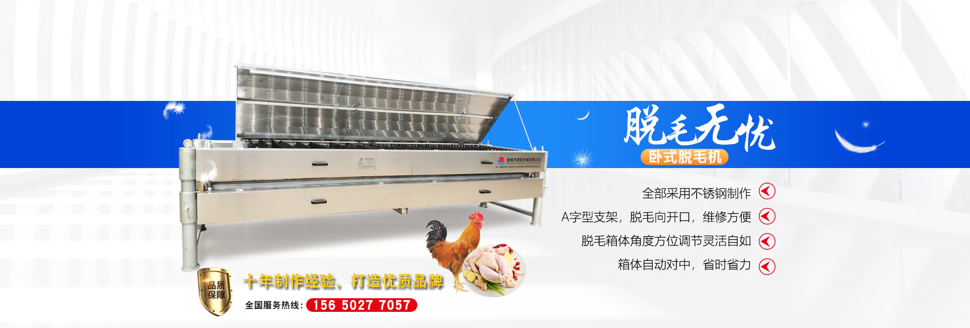 公司長期與國內(nèi)外屠宰加工企業(yè)合作,走引進——消化——創(chuàng)新和自主研發(fā)相結(jié)合的道路,在國內(nèi)外同類產(chǎn)品的基礎上,不斷更新和改造。公司主要設備有:A字型立式脫毛機、臥式脫毛機、強力噴淋機、松毛機、浸燙池、螺旋預冷機、禽籠清洗機、電暈機、兔扯皮機、兔割前爪/后爪機、剝胗機、自動洗鉤機、螺旋燙爪機、雞爪脫皮機、分割輸送帶等屠宰用設備。其中,公司獨力發(fā)明生產(chǎn)設計的“電動調(diào)節(jié)脫毛機”及“自動控水控溫浸燙池”順利通過知識產(chǎn)權(quán)局的實質(zhì)性審查。公司所生產(chǎn)的設備 可與國外同類產(chǎn)品配套使用,設備遠銷阿爾及利亞、澳大利亞等中東、非州等并建立了長期穩(wěn)定的合作關(guān)系。